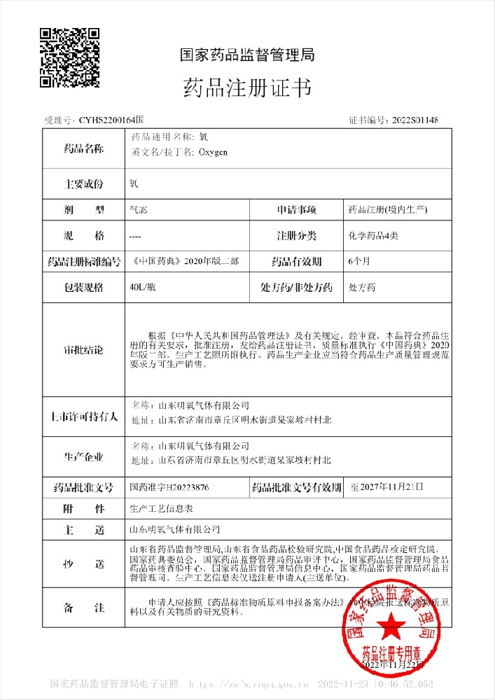 2022年12月取得國家藥品監(jiān)督管理局頒的藥品注冊(cè)證書,醫(yī)用氧項(xiàng)目正式投入生產(chǎn)
